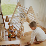 The LARGE Pikler Triple Climber Triangle features 3 different sides for climbing: one with ropes, another with wooden stepping blocks, and a third with dowels.