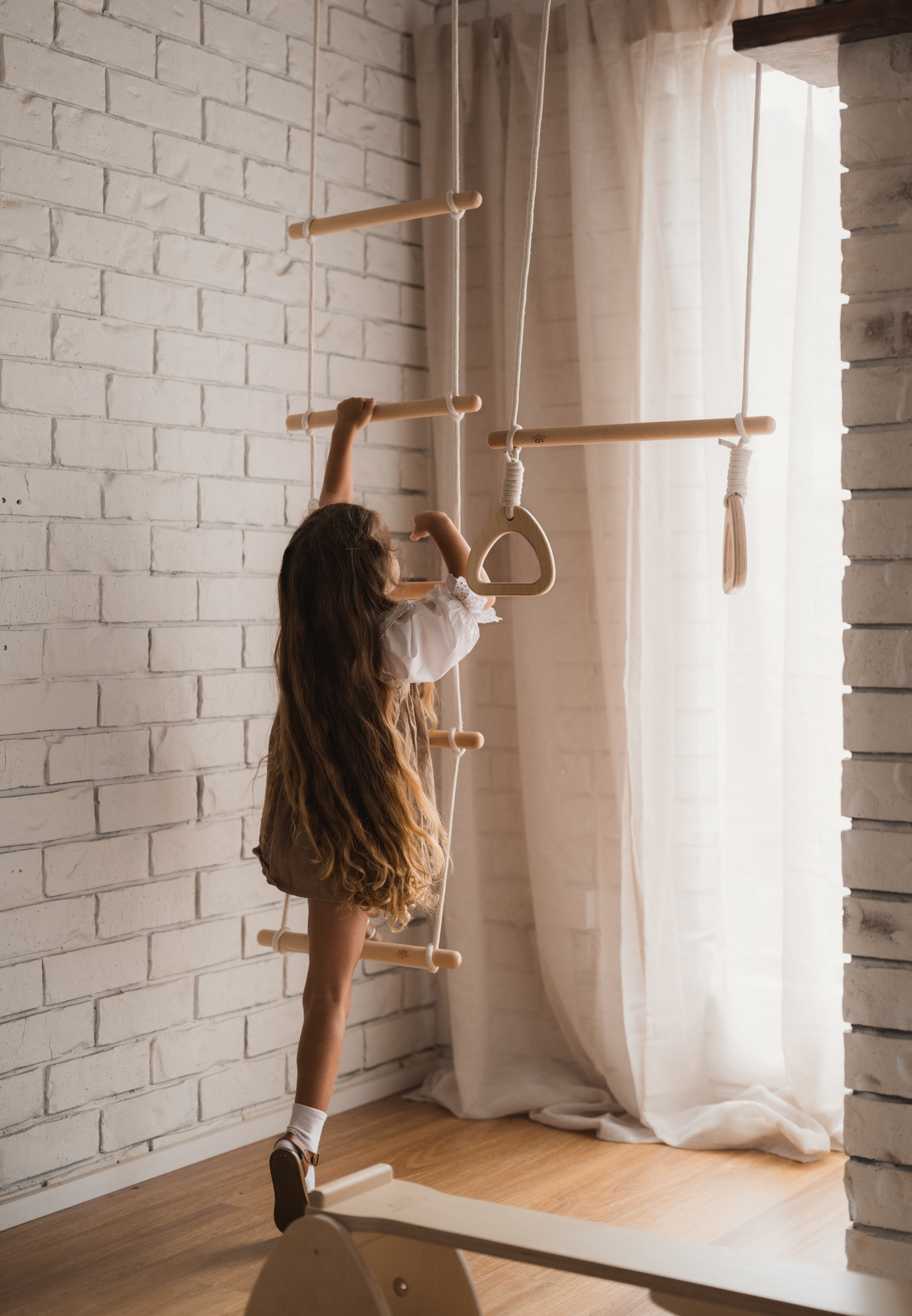 Do you dream of being an acrobat or gymnast? Your talents await your exploration! The Kinderfeets Trapeze with Rings is intentionally designed to support little bodies in physical activity. Hang from the adjustable teardrop rings or wooden bar, or sit on the trapeze and swing! During play, children gain flexibility and mind-body awareness, develop their balance and coordination, and grow stronger.