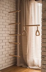 The Trapeze with Rings is crafted using beechwood, birchwood and rope. Wooden rope locks, nylon hanging straps and carabiners ensure the swing is optimally stable and child-safe (double-check all knots and locks are secure before using). Enjoy both indoors and out, but always store inside when not in use, and never leave your child unattended while playing.